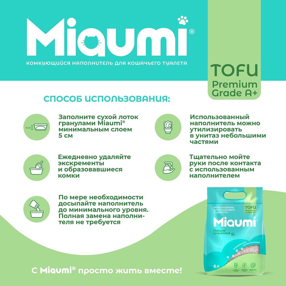 С Miaumi® TOFU Natural Unscented будет легко поддерживать чистоту и уют в доме, ведь наполнитель обеспылен на 99,9%, что позволит сохранять лапки питомца чистыми, как и пол в доме.