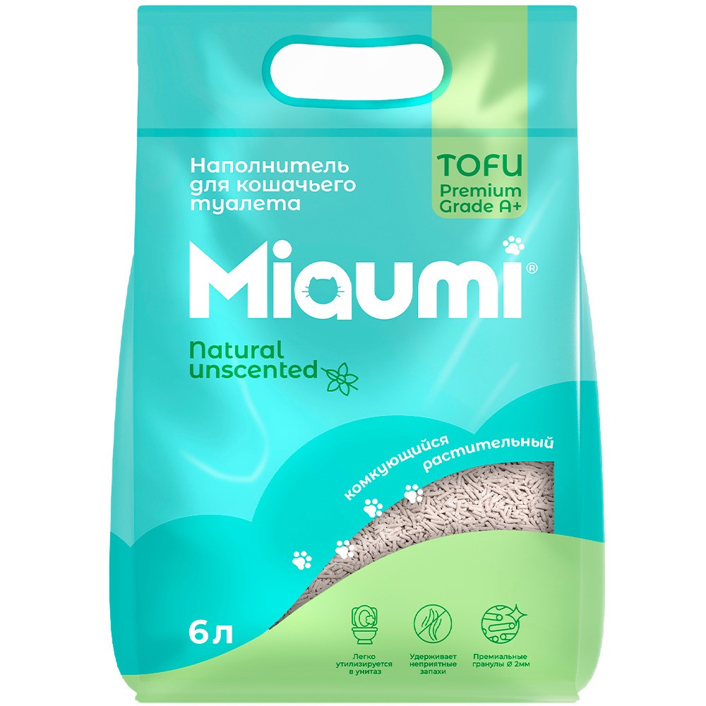 Miaumi® TOFU Natural Unscented – натуральный наполнитель для кошачьего туалета из спрессованных соевых волокон без ароматизатора.