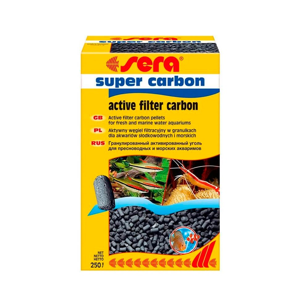 SERA super carbon уголь — быстро и надежно абсорбирует токсины и красящие вещества из аквариумной воды. Желтоватый оттенок исчезает и аквариумная вода становится кристально-чистой. SERA супер
