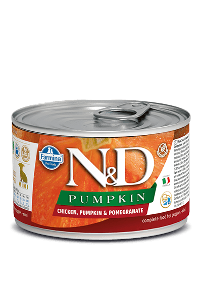 N&D Dog Chicken & Pumpkin & Pomegranate Puppy Mini — полнорационный влажный корм для щенков и кормящих сук или кормящих сук с курицей, тыквой и гранатом.