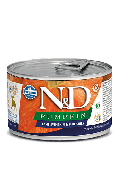 Farmina N&D Dog Lamb, Pumpkin & Blueberry Puppy Mini — это беззерновой полнорационный влажный корм для щенков в небольшой банке со вкусом тыквы, ягненка и черники.