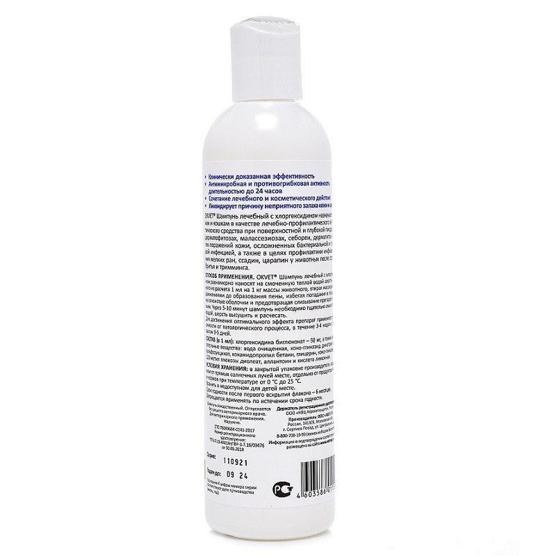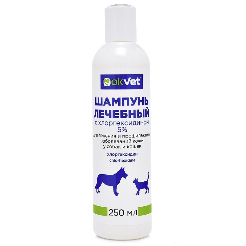«ОКVЕТ® Шампунь лечебный с хлоргексидином» назначают в качестве лечебнопрофилактического и антисептического средства собакам и кошкам при поверхностной и глубокой пиодермии, при дерматофитозах и