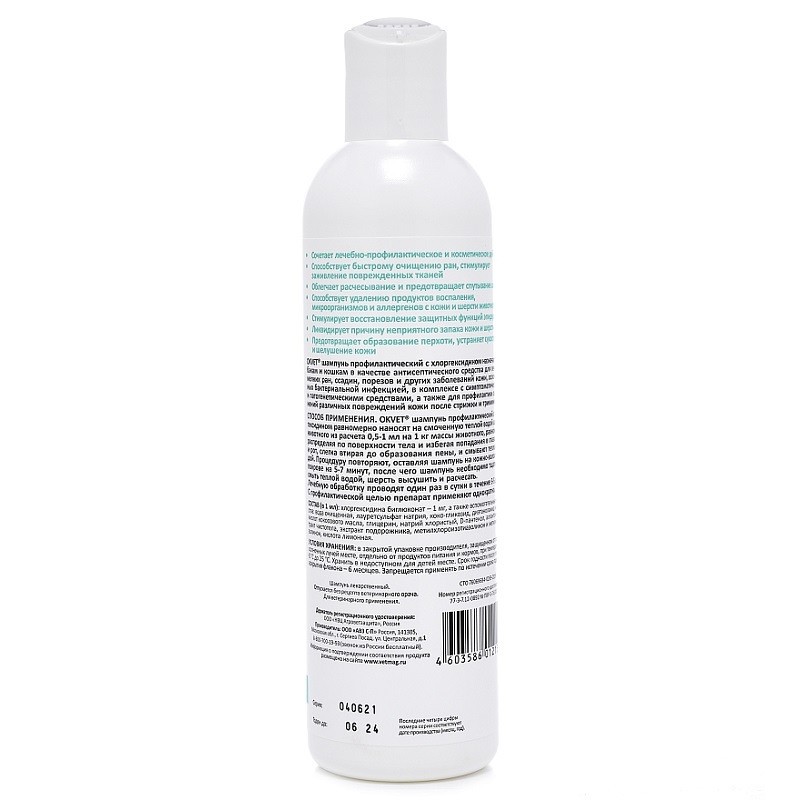 ОКVЕТ Шампунь профилактический с хлоргексидином назначают собакам и кошкам в качестве антисептического средства для лечения мелких ран, ссадин, порезов и других заболеваний кожи,