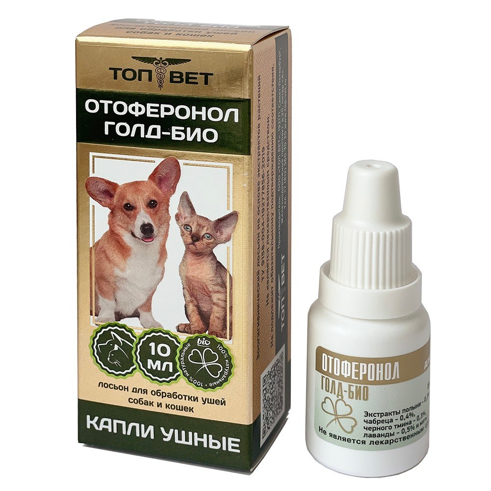 Отоферонол Голд-Био – зоогигиенический лосьон (капли) для гигиенической обработки ушей собак и кошек с целью безболезненного и атравматичного удаления из ушной раковины и слухового прохода серы и
