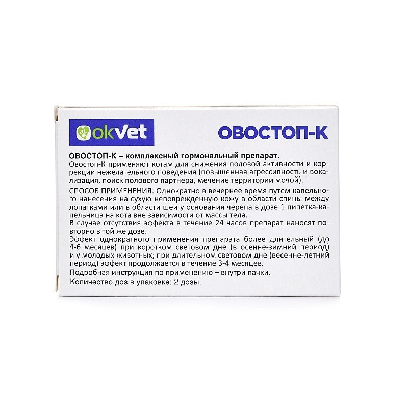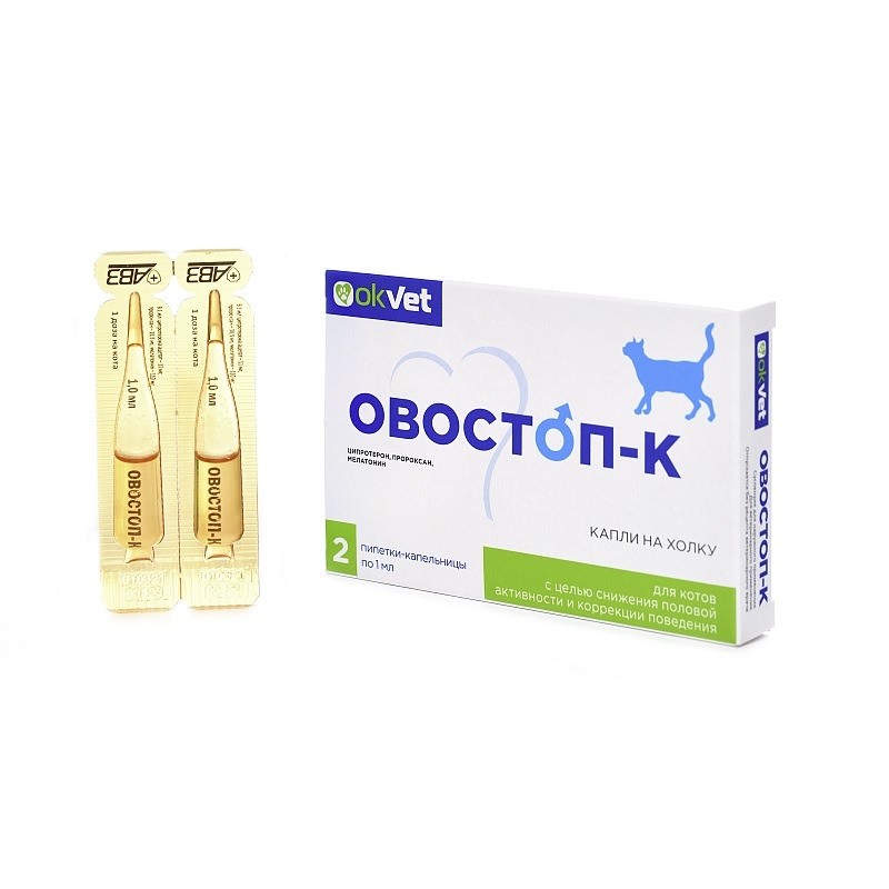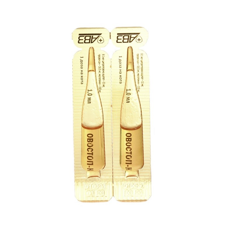 Овостоп-К выпускают в одноразовых полимерных пипетках-капельницах, котам 2 пипетки по 1 мл.