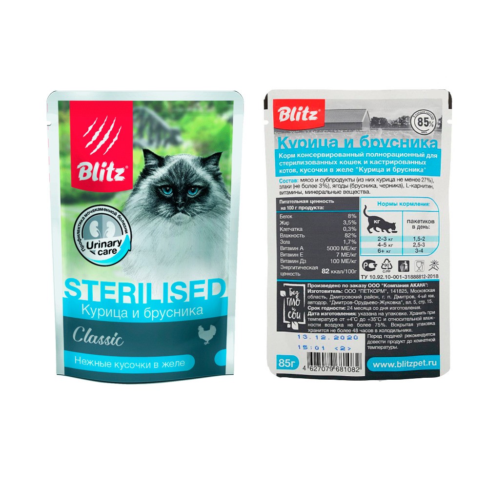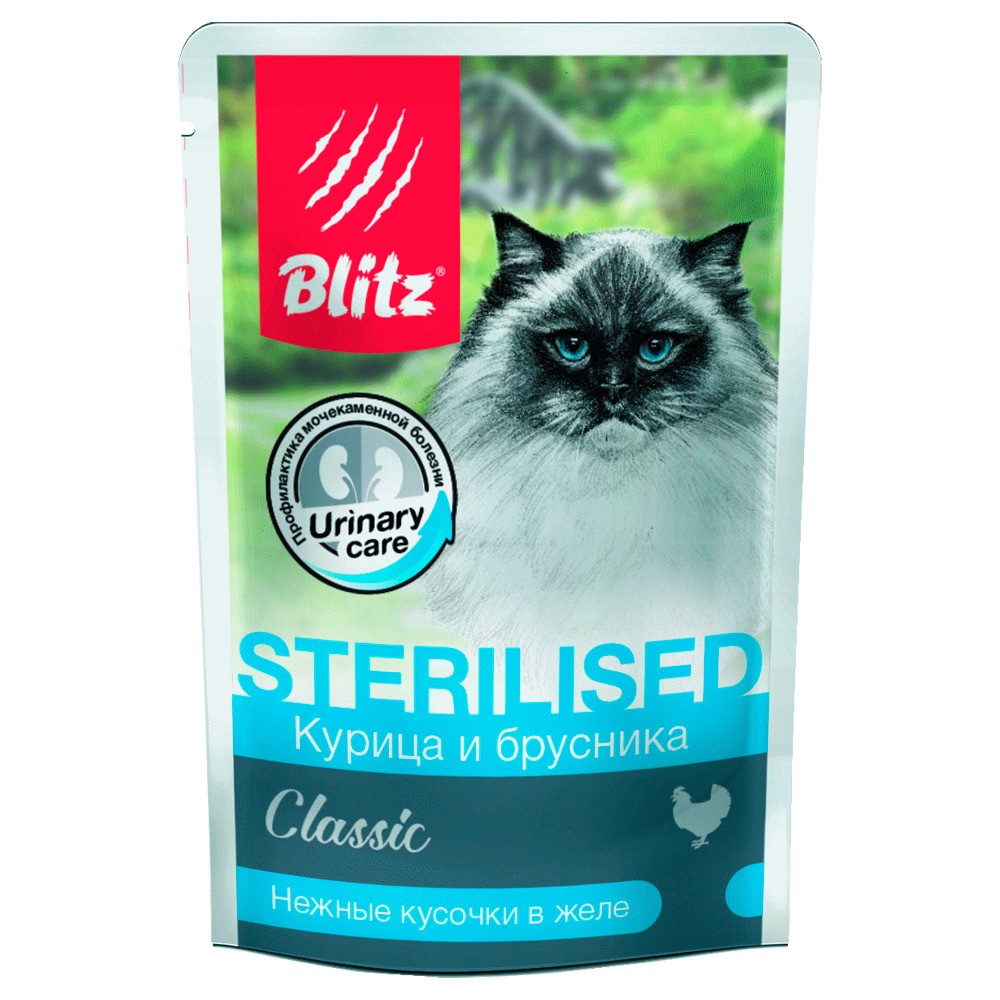 Именно таким и является влажный корм для кошек Blitz «Курица и брусника», ведь благодаря сбалансированном составу он не только способствует профилактике мочекаменной болезни, но также обладает