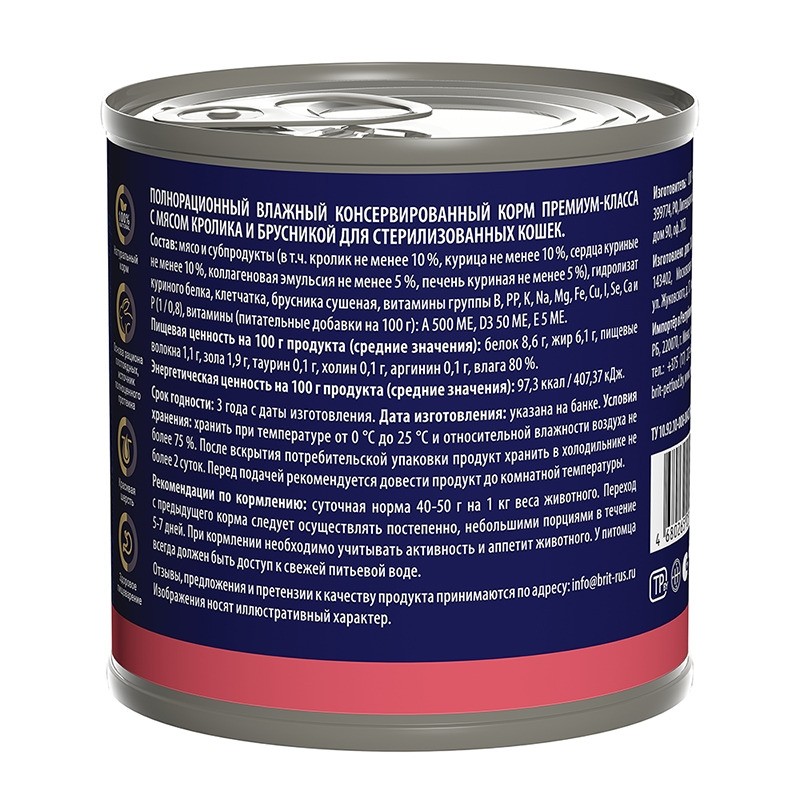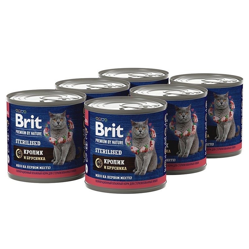 Brit Premium by Nature Sterilised — полнорационный консервированный корм премиум класса с кроликом и брусникой для взрослых стерилизованных кошек.