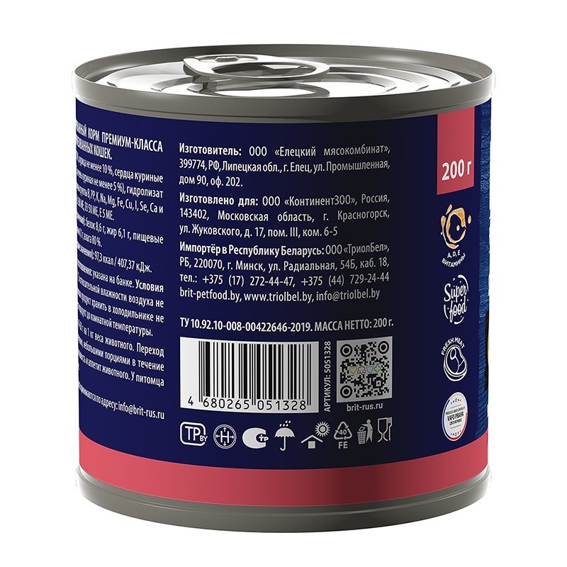 равнодушным вашего питомца. Таурин в составе – важный ингредиент для поддержания остроты зрения и здоровья сердечно-сосудистой системы кошек. Консервированный корм содержит все необходимые витамины