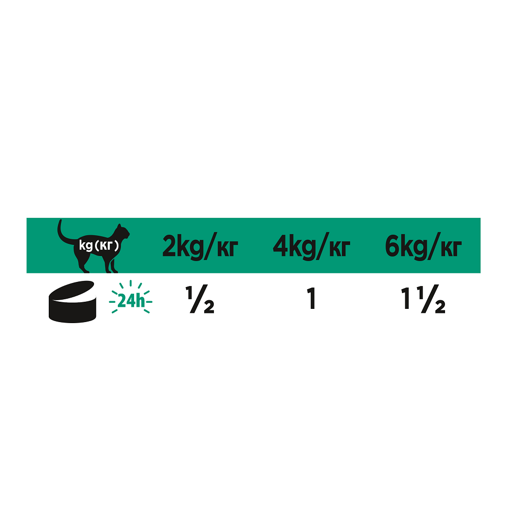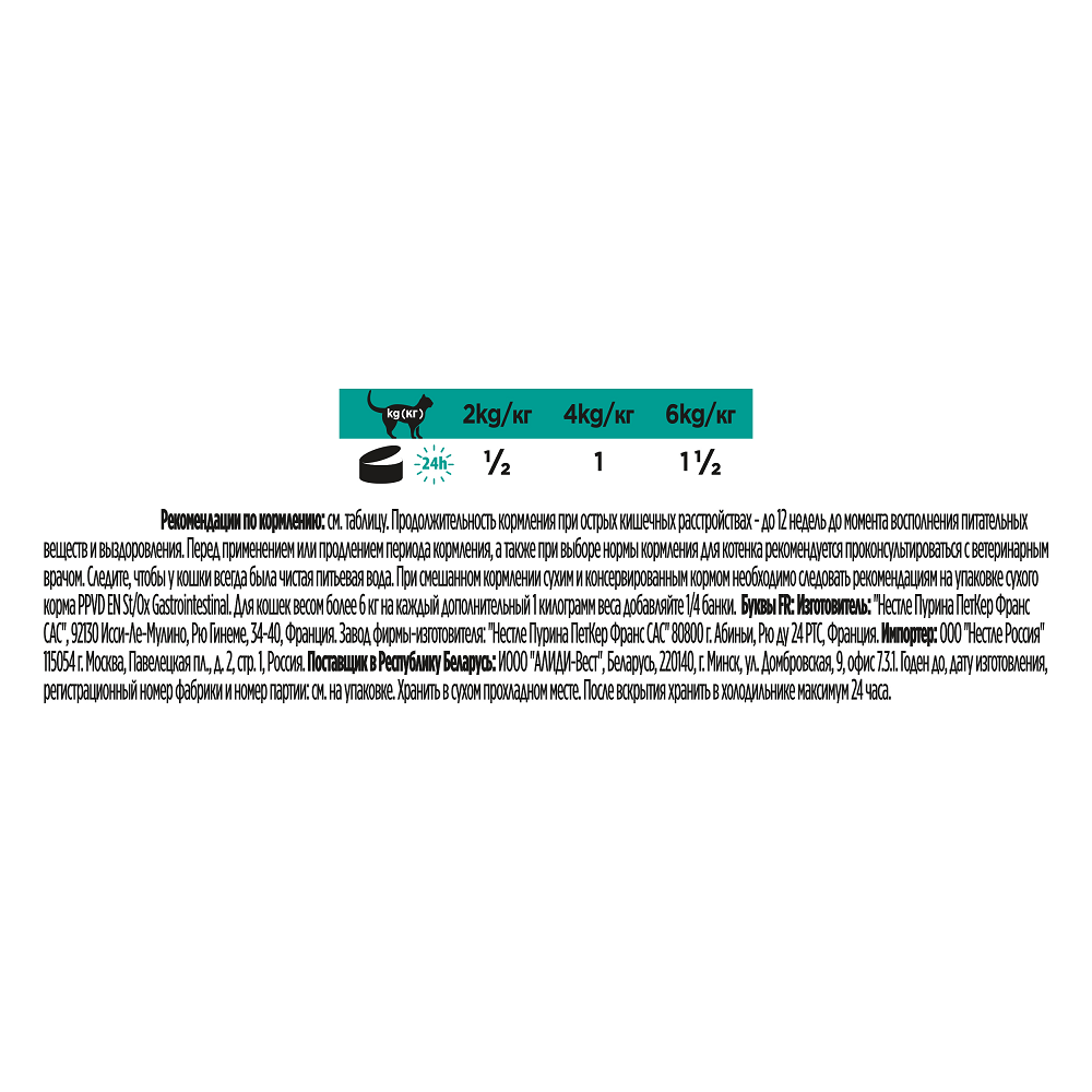 При смешанном кормлении сухим и консервированным кормом необходимо следовать рекомендациям на упаковке сухого корма PPVD EN St/Ox Gastrointestinal. Для кошек весом более 6 кг на каждый