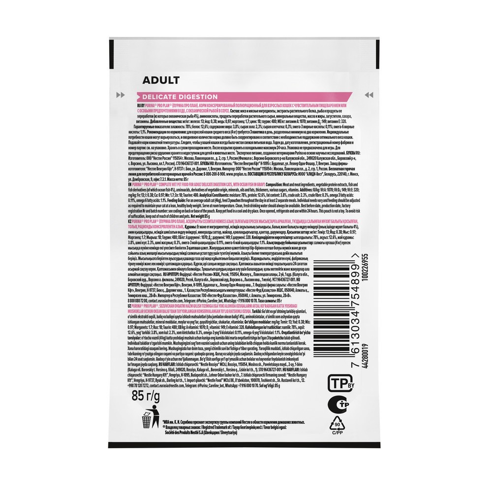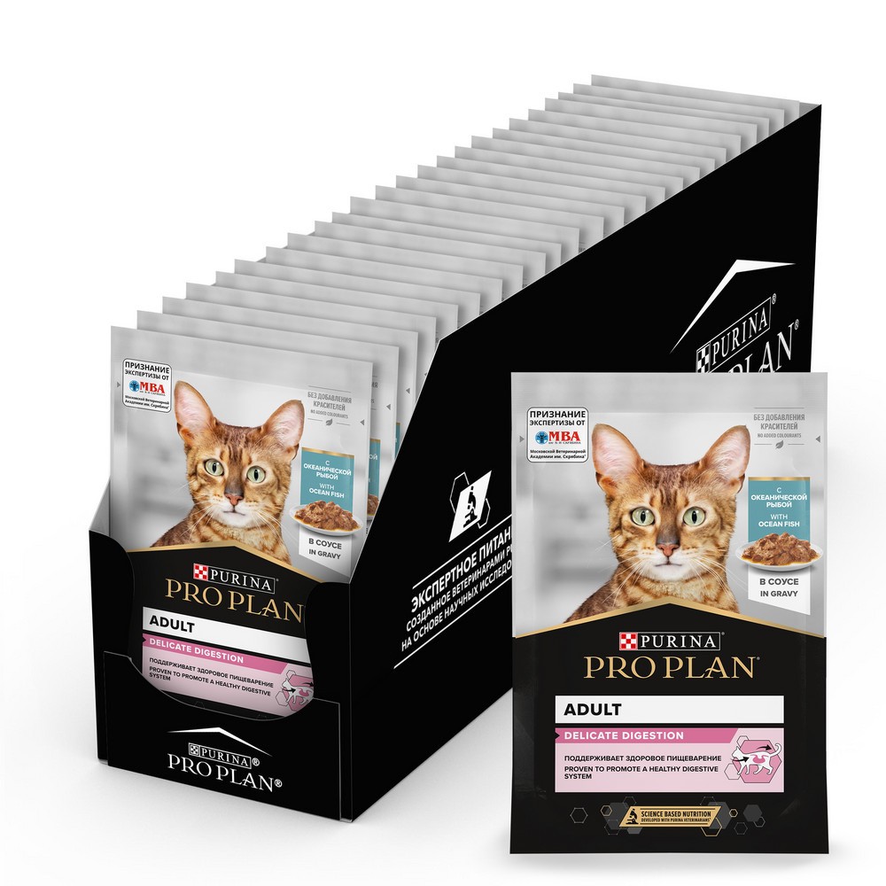 Purina Pro Plan Delicate Digestion Adult — консервированный полнорационный корм с океанической рыбой в соусе для взрослых кошек с чувствительным пищеварением или особыми