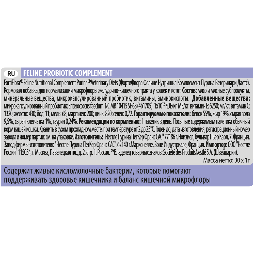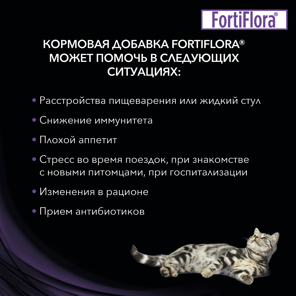 Pro Plan Veterinary Diets FortiFlora Feline Probiotic Complement — уникальная кормовая добавка для кошек и котят для поддержания баланса микрофлоры и здоровья кишечника.