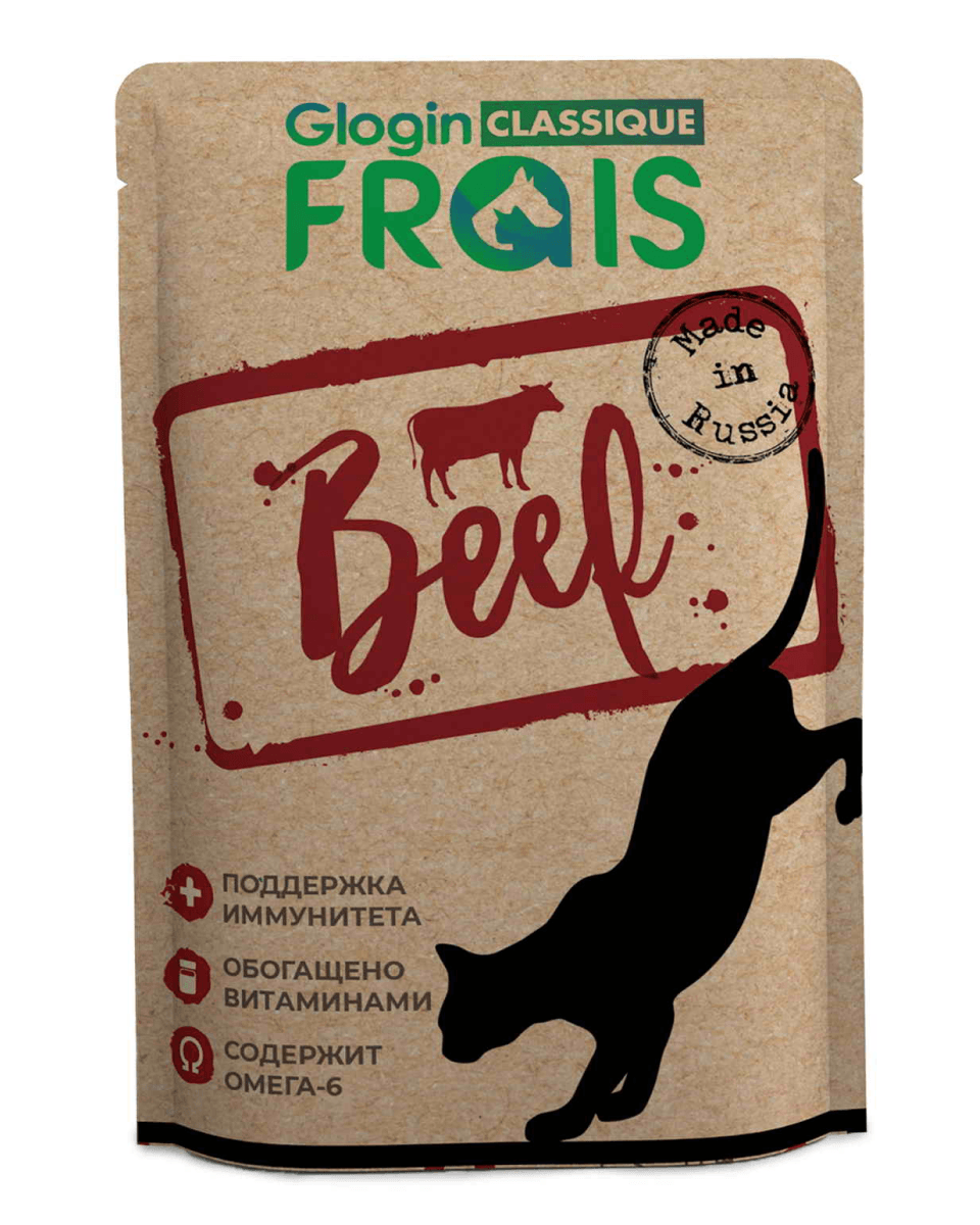 Frais Classique Beef — полнорационный консервированный корм с говядиной в нежном соусе для взрослых кошек всех пород.