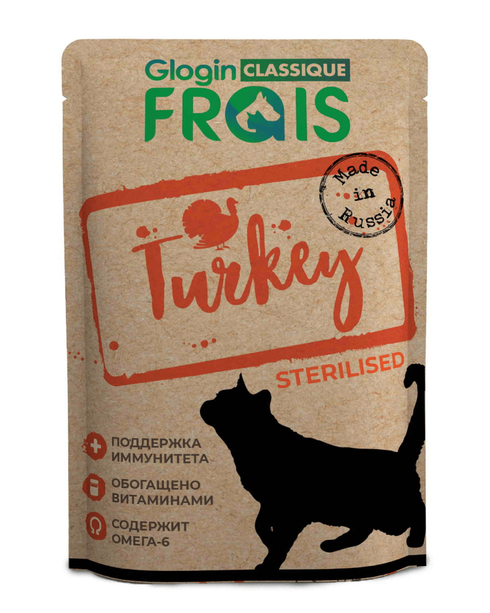Frais Classique Sterilised Turkey — полнорационный консервированный корм с индейкой в нежном соусе для стерилизованных кошек всех пород.