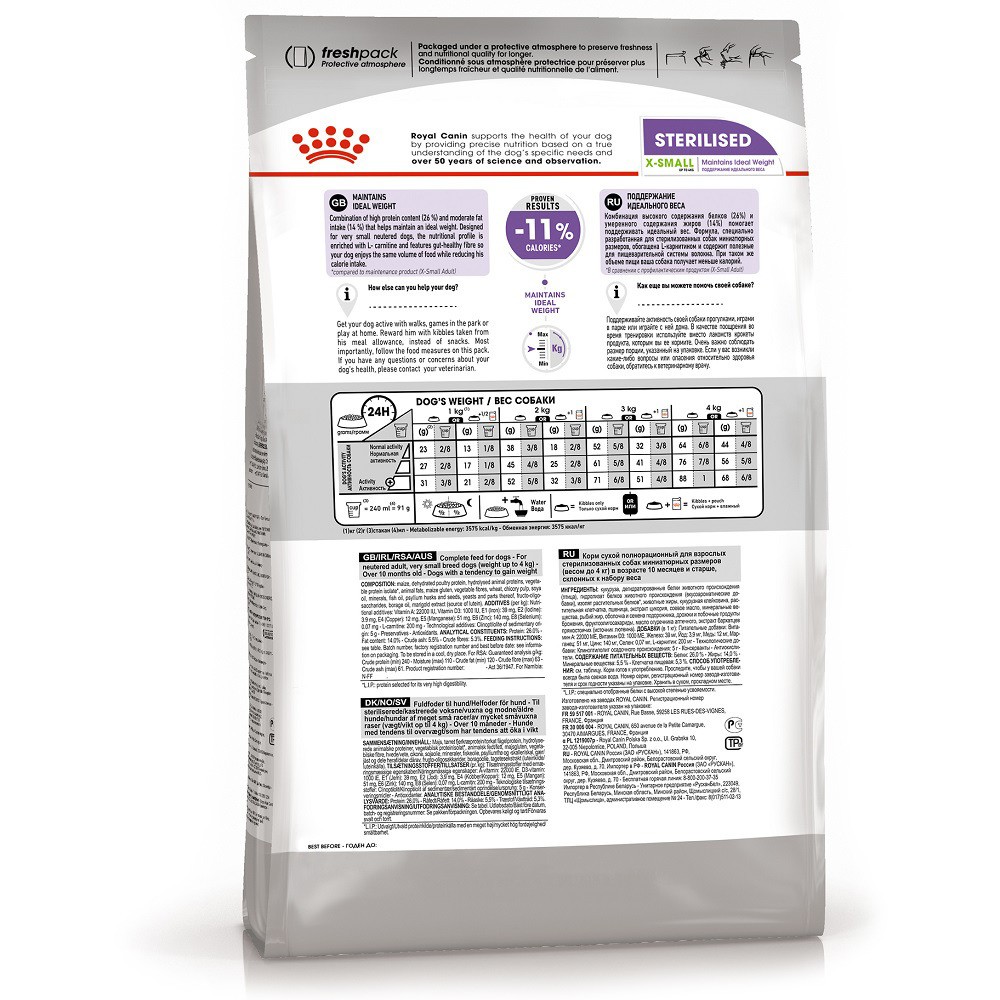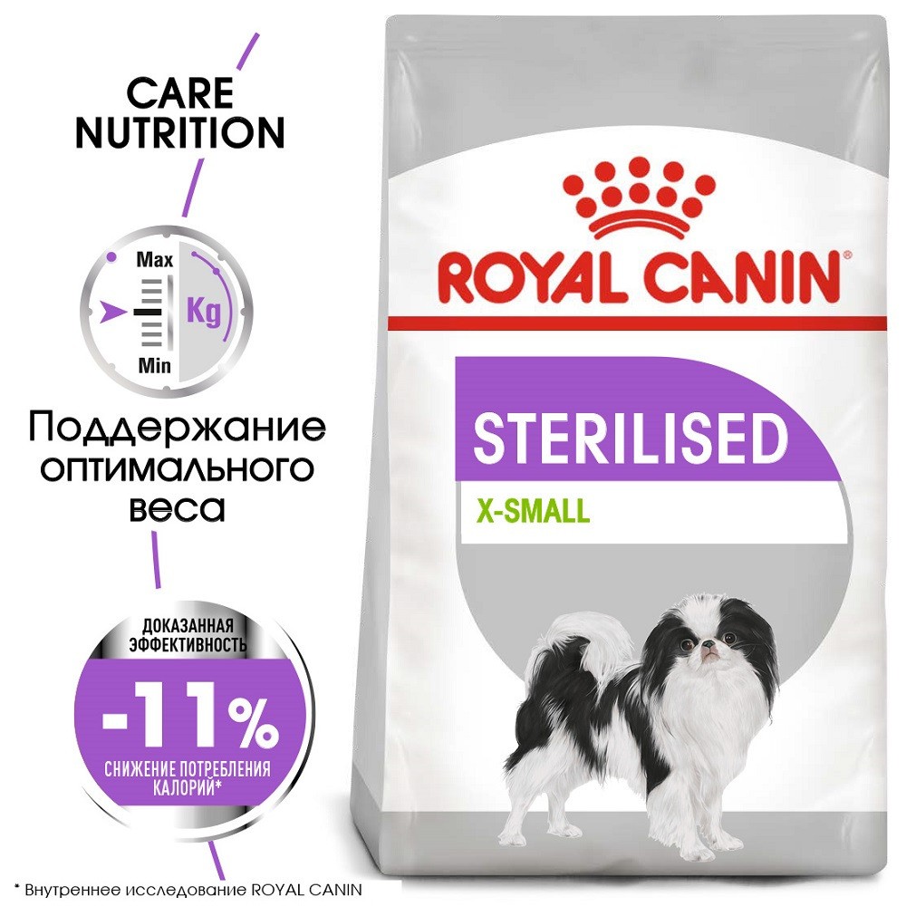 Royal Canin X-Small Sterilised (Икс-смол стерилайзд) — полнорационный корм для взрослых стерилизованных собак миниатюрных размеров (весом до 4 кг) в возрасте 10 месяцев и старше, склонных к