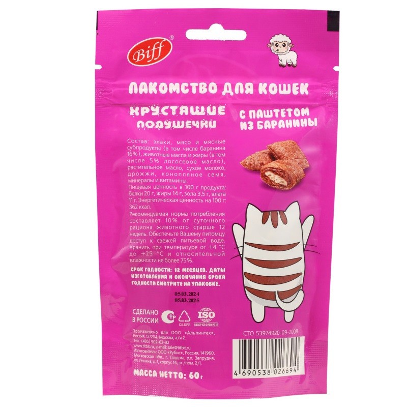 Хрустящие подушечки для кошек с паштетом из баранины – это вкусное и полезное лакомство. Паштет, содержащийся внутри каждой подушечки, имеет мягкую однородную консистенцию в виде мусса и