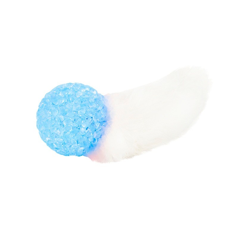 Привлекательная натуральная игрушка для кошек — высушенный кроличий хвост в шерсти, прикреплённый к пластиковому мячику с бубенчиком.