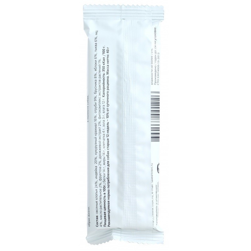 Овсяные хлопья 24%, индейка 20%, кукурузный крахмал 16%, отруби 9%, брусника 8%, яблоки 6%, тыква 6%, мед 4%, масло растительное 2%, фруктоза 2%, дрожжевой экстракт 2%, фитокомплекс экстрактов