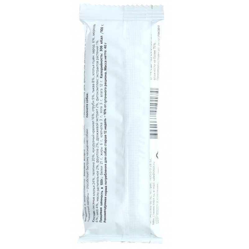 Овсяные хлопья 24%, телятина 20%, кукурузный крахмал 16%, отруби 9%, тыква 8%, хлопья пшен. зарод. 6%, морковь 6%, мед 4%, масло растительное 2%, фруктоза 2%, дрожжевой экстракт 2%, фитокомплекс