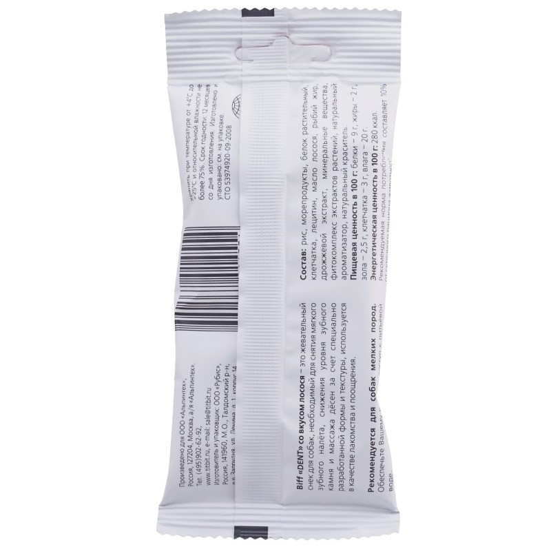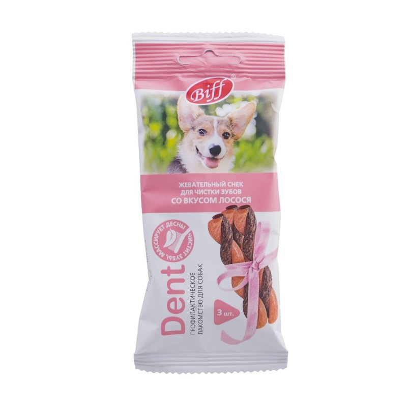 Biff «DENT» со вкусом лосося – это жевательный снек для собак, необходимый для снятия мягкого зубного налёта, снижения уровня зубного камня и массажа дёсен за счет специально разработанной формы и