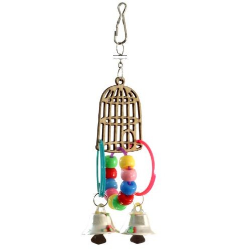 Игрушка для птиц в виде клетки с подвесками из бус и пластиковых колец с колокольчиками.