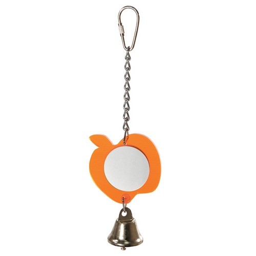 Игрушка для птиц в форме яблока с круглым зеркальцем и колокольчиком.