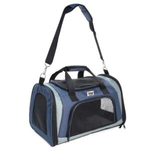 Переноска открывается впереди и сбоку, имеет 2 кармана, ремешок безопасности и съемный плечевой ремень.