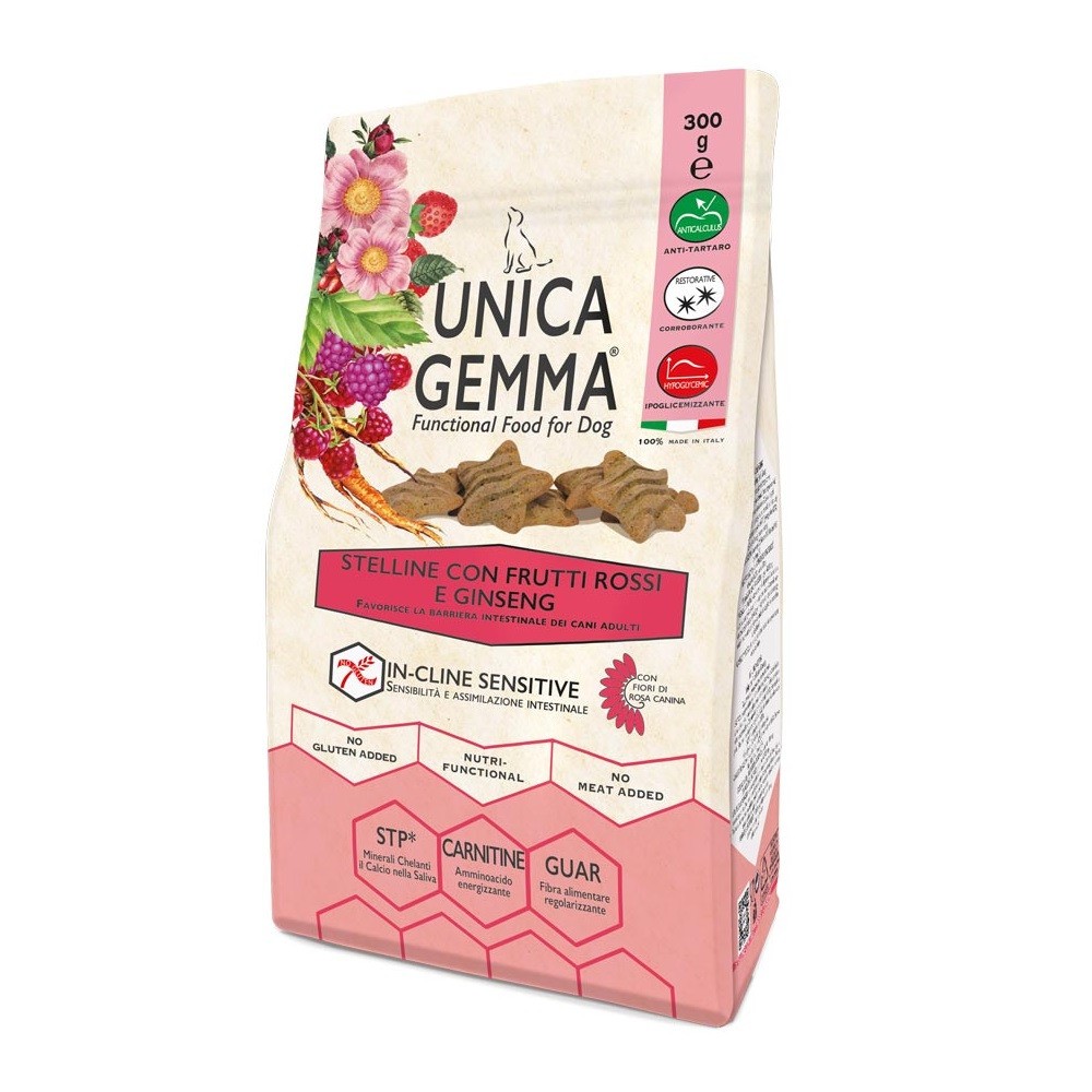 Unica Gemma Stelline con Frutti Rossi e Ginseng — безглютеновое песочное печенье с бархатистой корочкой, с красными фруктами, ароматом женьшеня и ароматом шиповника. Функциональная полезная