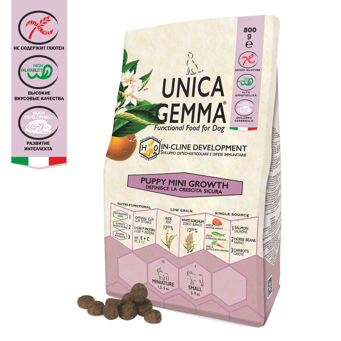 тела от 1,5 до 10 кг. Он специально разработан для развития, роста и укрепления мышечно-скелетной массы щенков. Корм Unica Gemma содержит все необходимые ингредиенты для правильного развития и