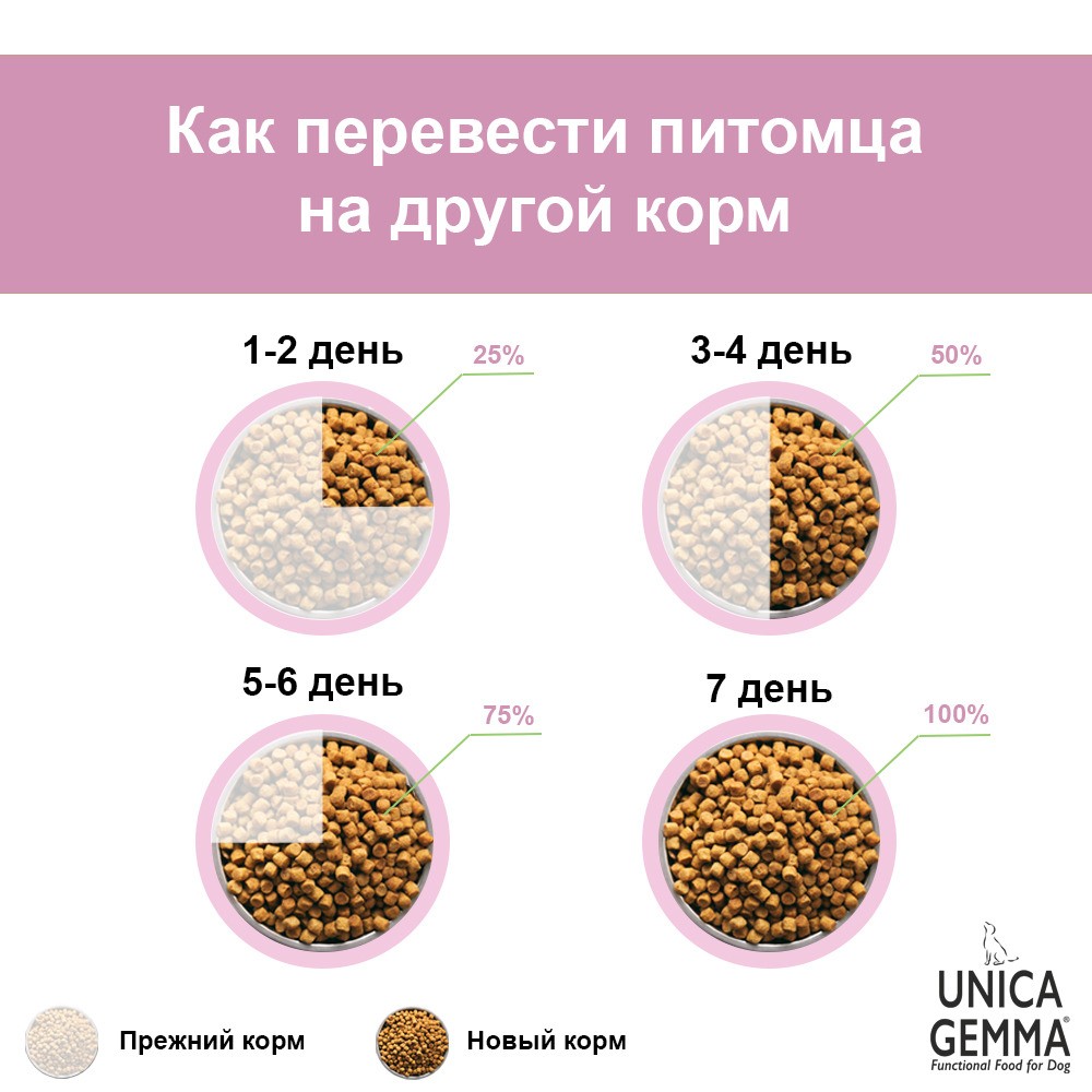 Данный корм подходит для кормления с 2 месяцев. Одним из преимуществ Unica Gemma является лёгкий переход на данный корм без стресса и пищевых расстройств. Достаточно в течение 7 дней увеличивать