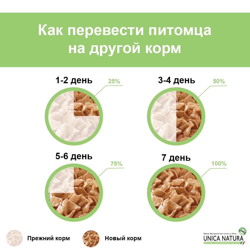 Одним из преимуществ Unica Natura является лёгкий переход на данный корм без стресса и пищевых расстройств. Достаточно в течение 7 дней увеличивать содержание нового корма по отношению к прежнему.