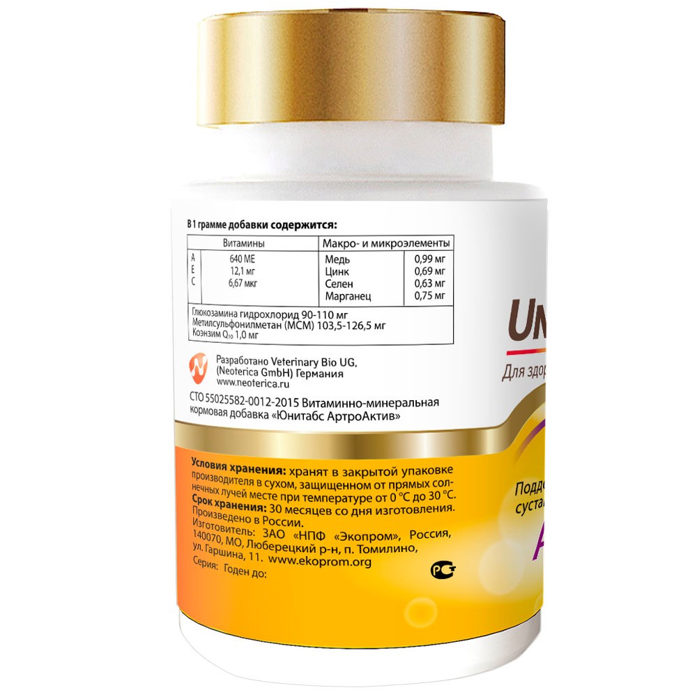 Unitabs ArthroActive с Q10 (Юнитабс АртроАктив) с глюкозамином и МСМ — это витаминно-минеральный комплекс для собак, который содержит коэнзим Q10 и все необходимые витамины, макро- и