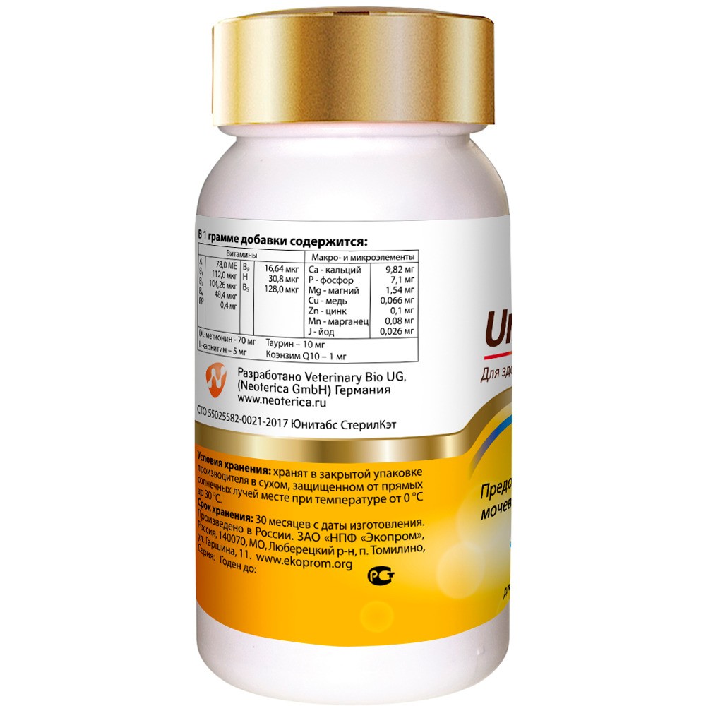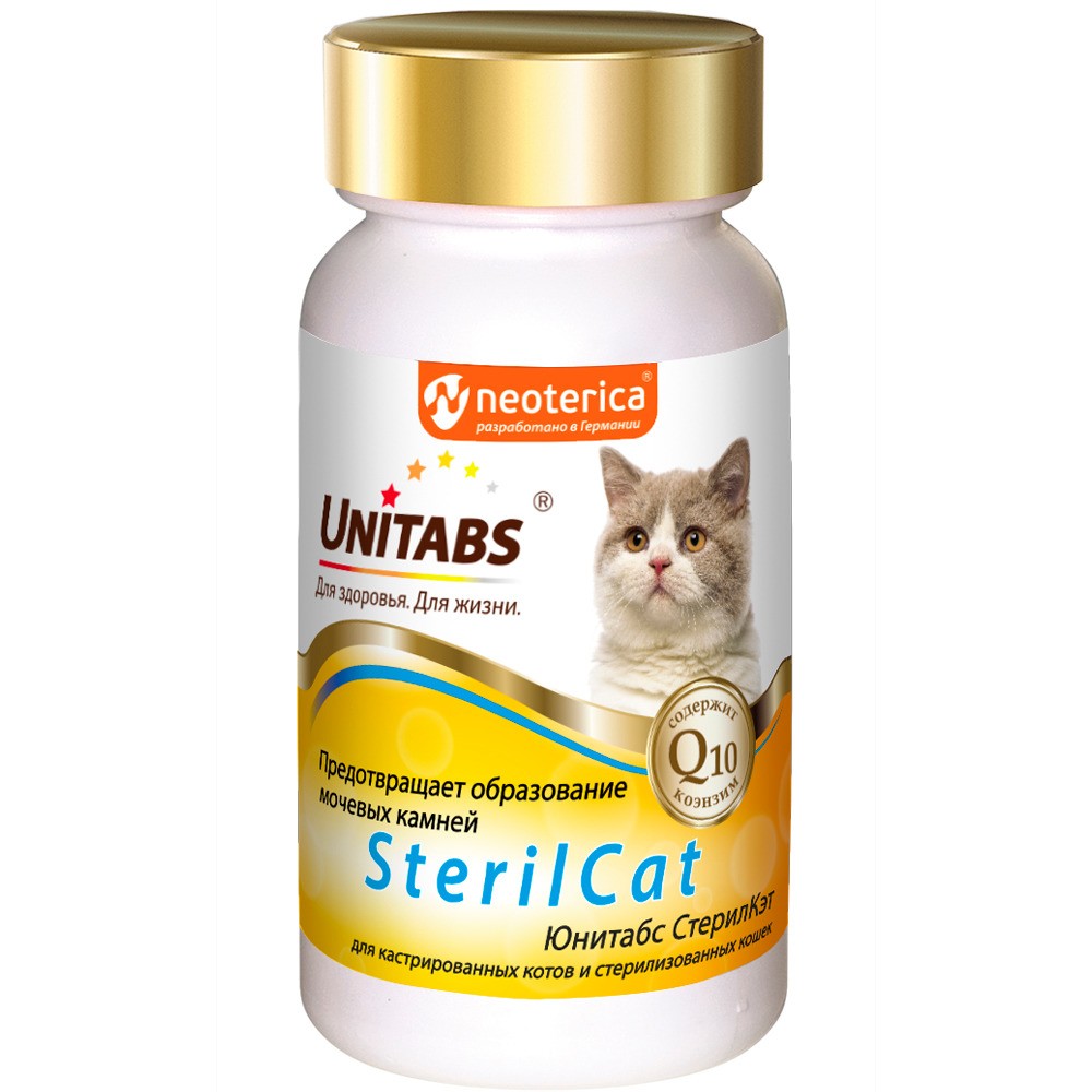 Unitabs SterilCat (Юнитабс СтерилКэт) — это витаминно-минеральный комплекс для кастрированных котов и стерилизованных кошек, который содержит коэнзим Q10 и все необходимые витамины, макро- и