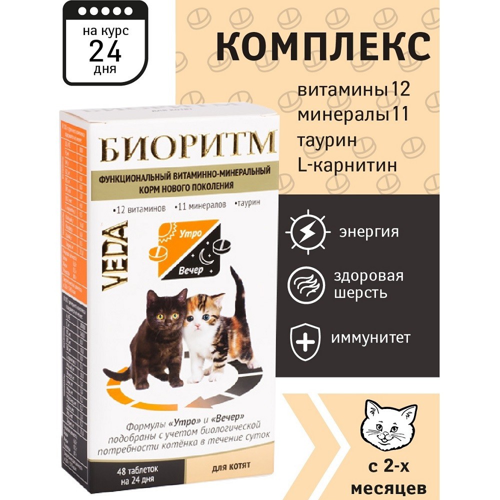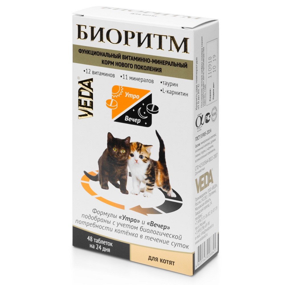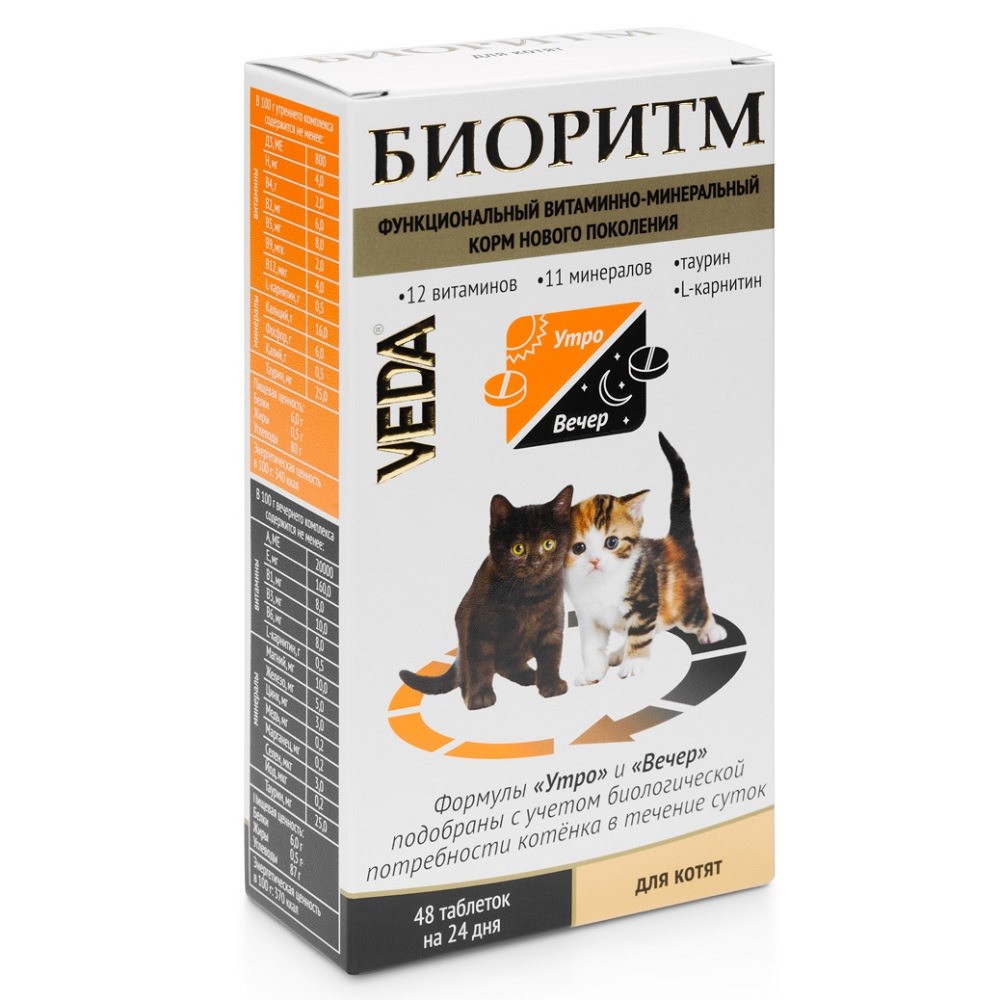 VEDA Биоритм для котят — витаминно-минеральный комплекс, который является функциональным (оздоровительным) кормом нового поколения. Содержит полностью усваиваемые формы витаминов и