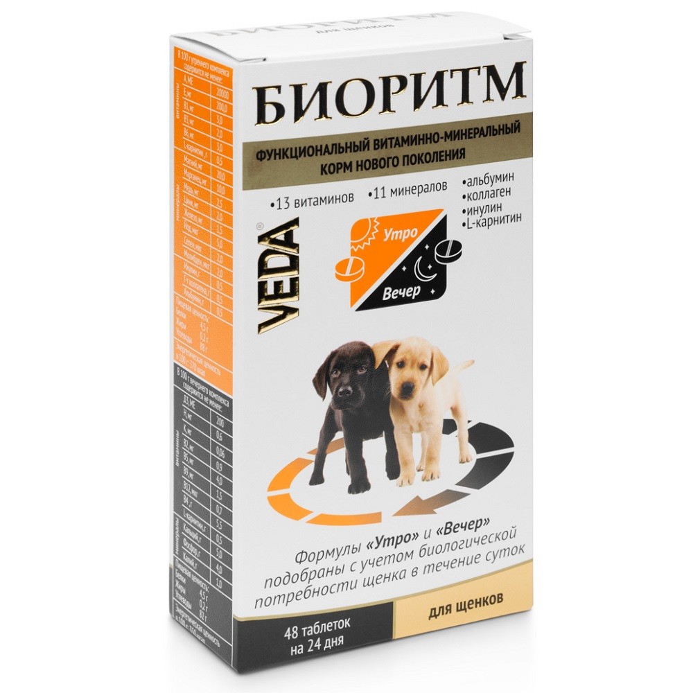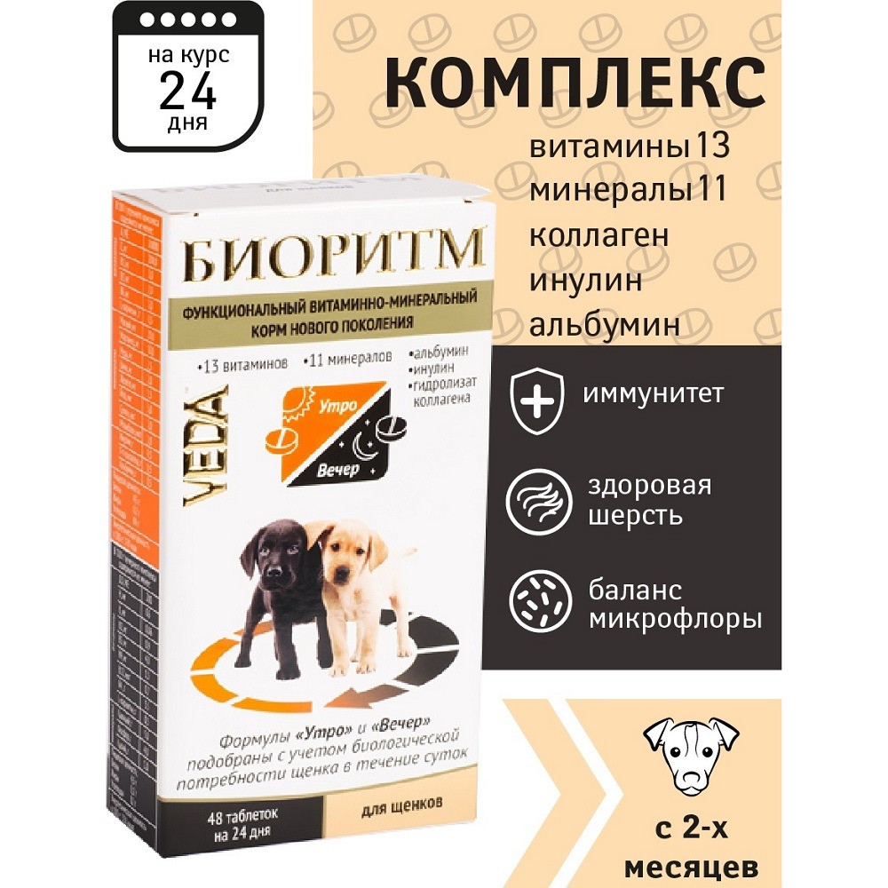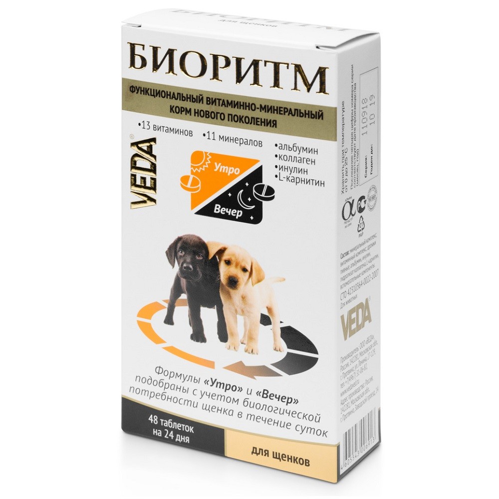 Веда Биоритм для щенков — витаминно-минеральный комплекс, который является функциональным (оздоровительным) кормом нового поколения. Содержит полностью усваиваемые формы витаминов и