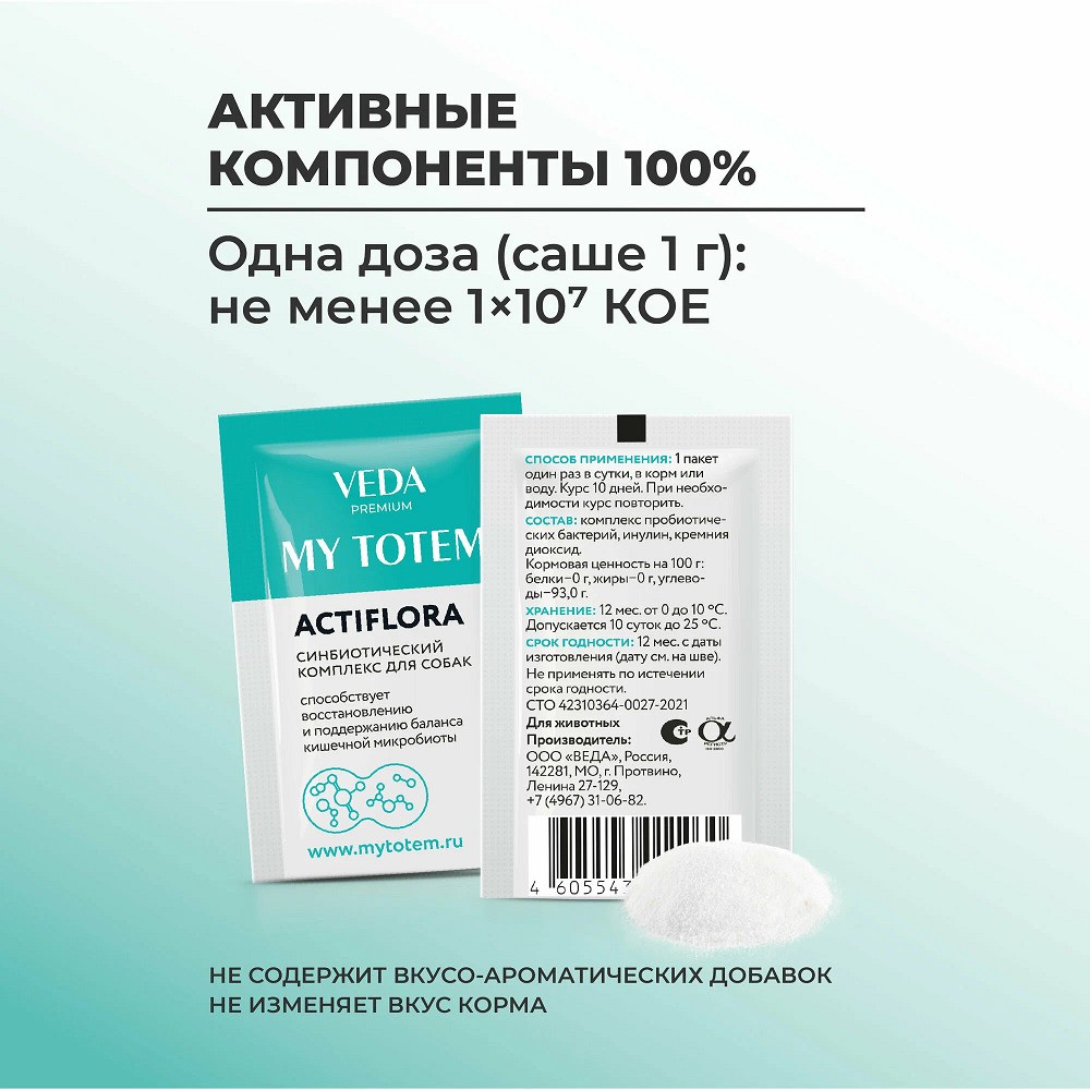 MY TOTEM ACTIFLORA синбиотический комплекс для собак предназначен для введения полезной микрофлоры в составе кормовых рационов животных с раннего (3-х месячного) возраста. Допустимо применение