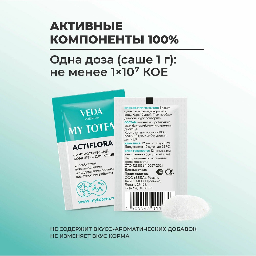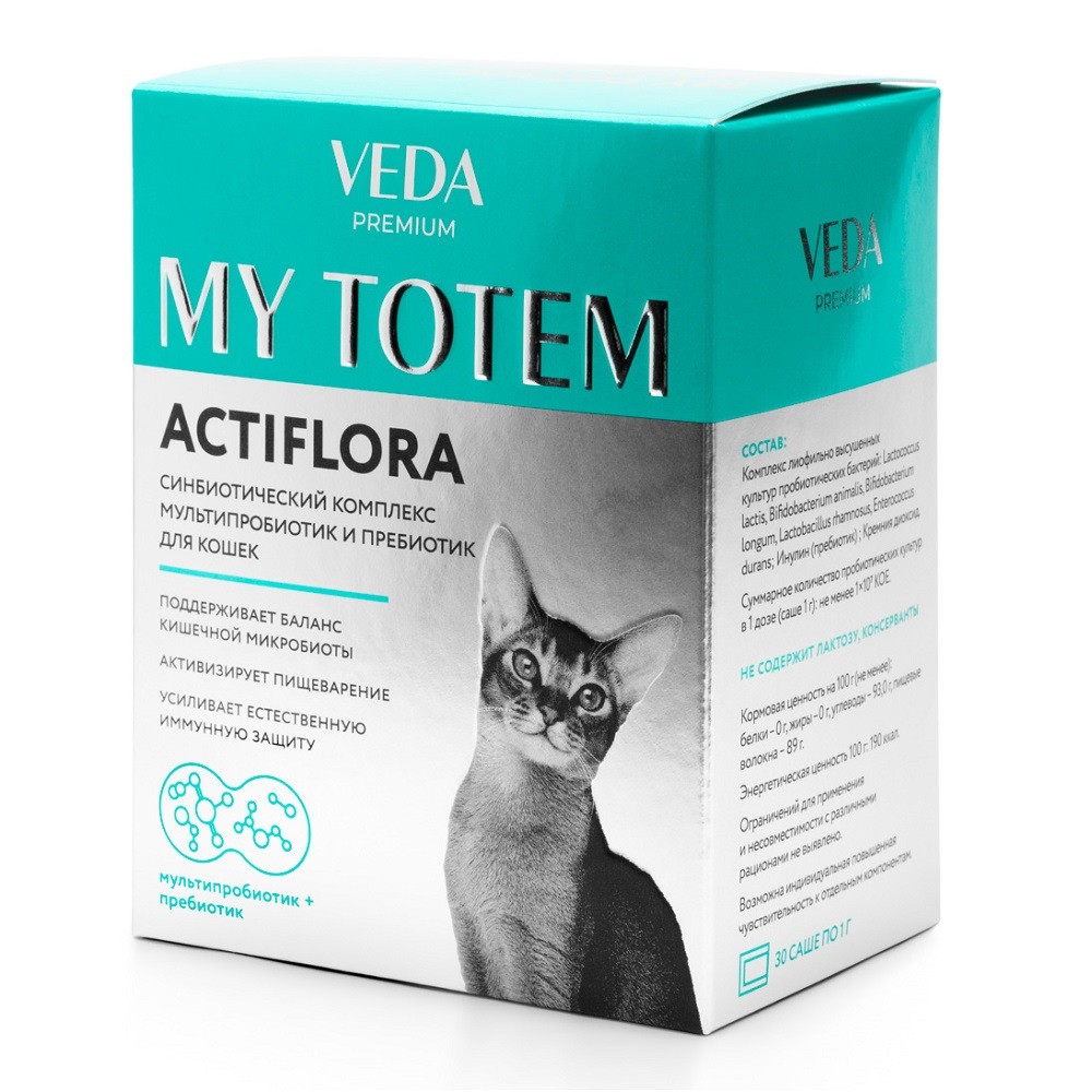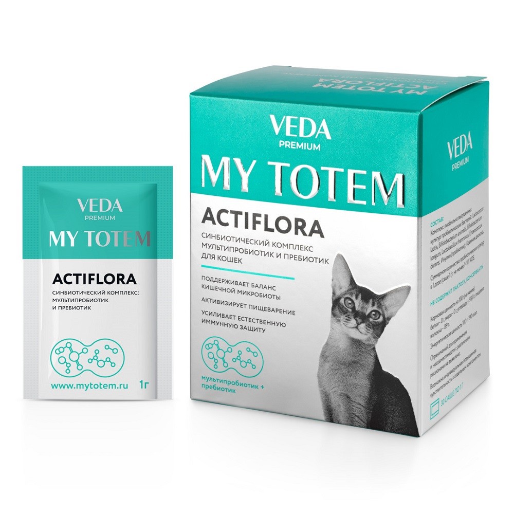 MY TOTEM ACTIFLORA синбиотический комплекс для кошек предназначенный для введения полезной микрофлоры в составе кормовых рационов животных с раннего (3-х месячного) возраста. Допустимо применение